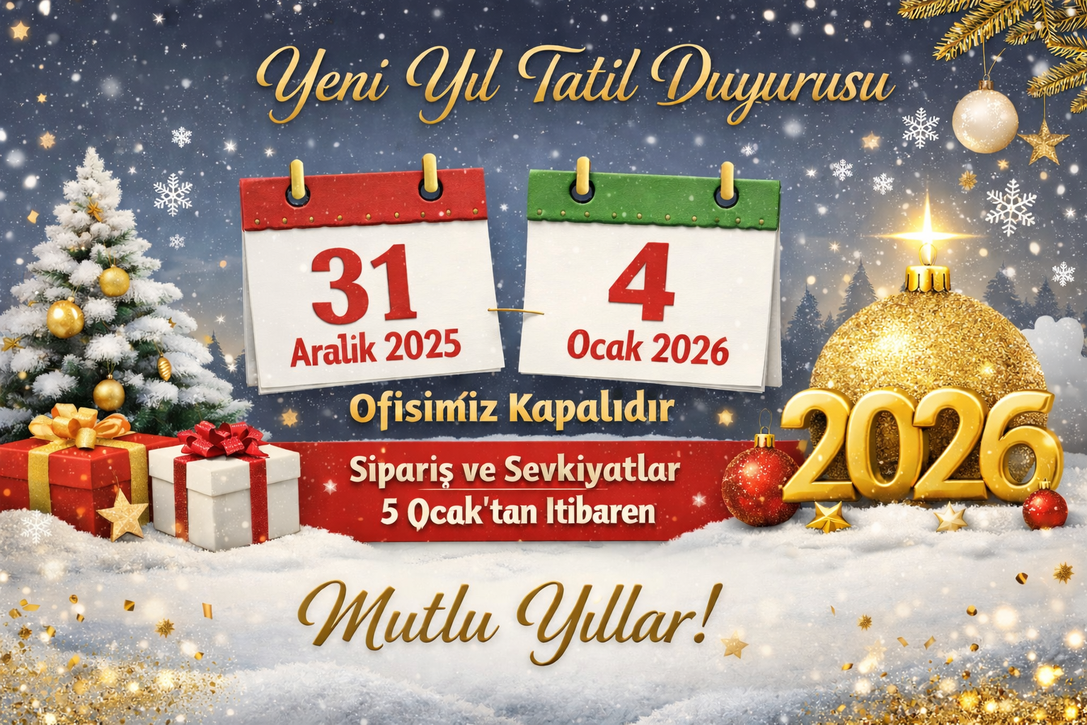 Bu süre zarfında ofisimizde sipariş ve sevkiyat işlemleri gerçekleştirilemeyecek olup, tüm işlemler 05.01.2026 tarihinden itibaren yeniden başlatılacaktır.